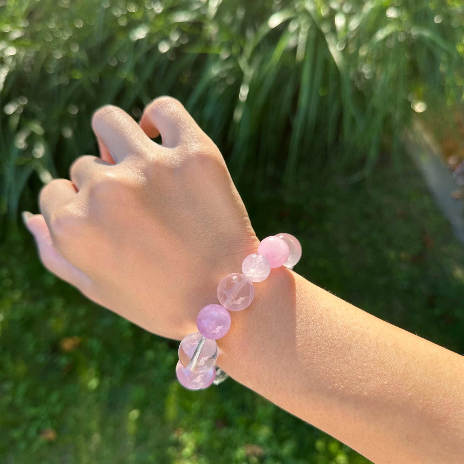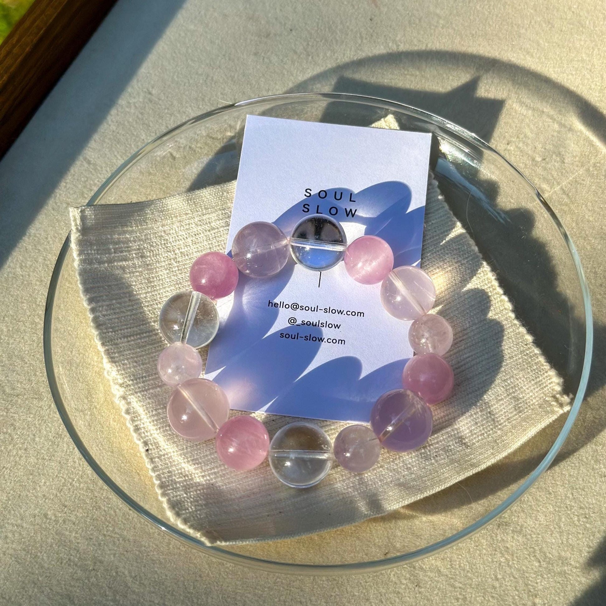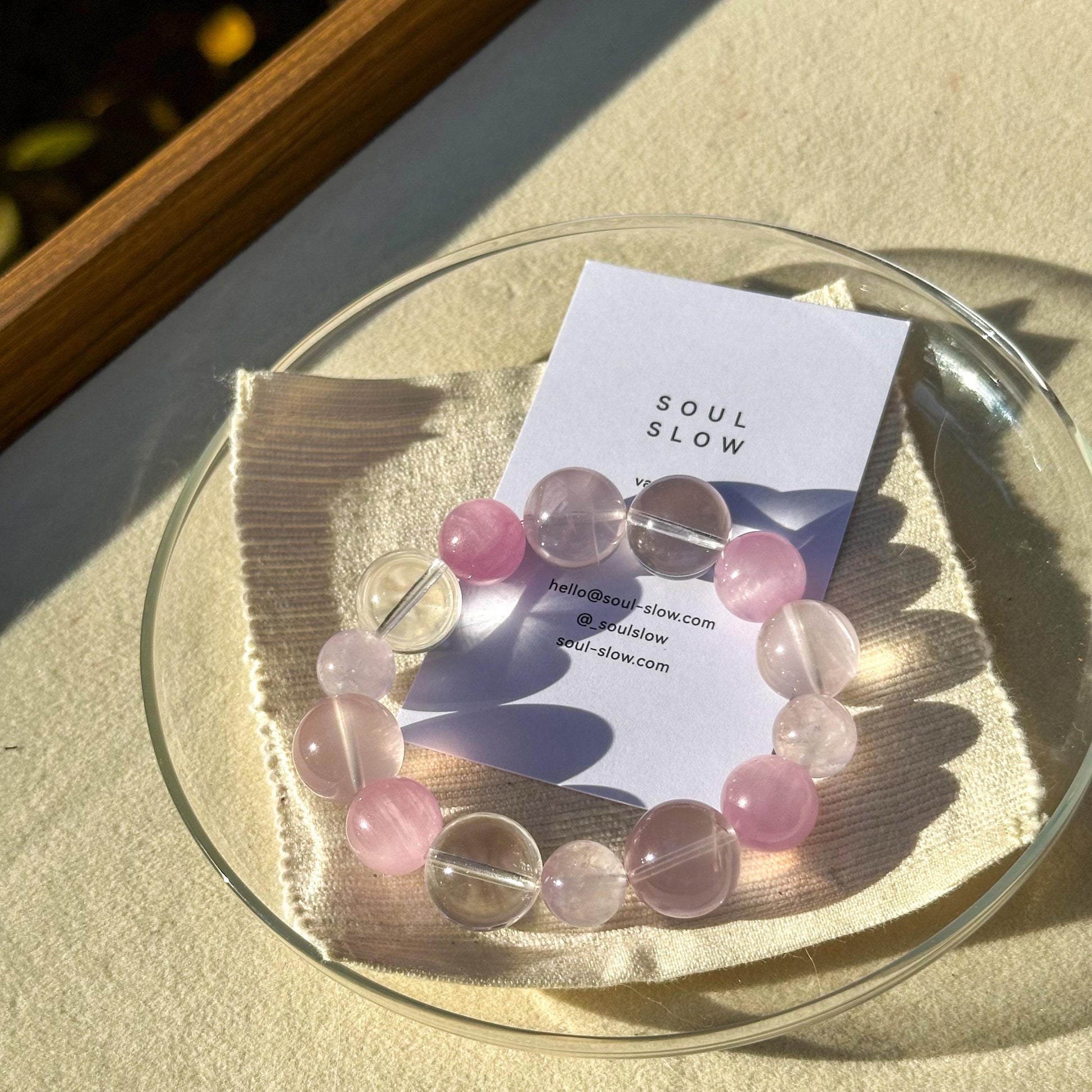 Rose quartz, kunzite, lavender quartz, and clear quartz come together to create a quiet sense of ease - something to return to when the day feels full.