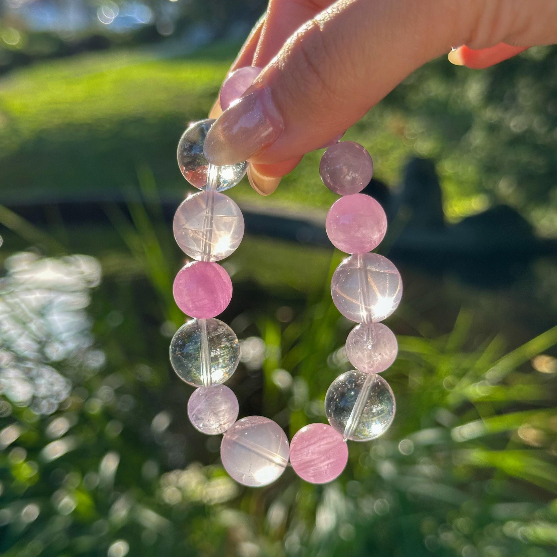 - Handcrafted with genuine stone beads (approx. 11 mm), showcasing an ethereal palette of clear, purple, and pink tones.