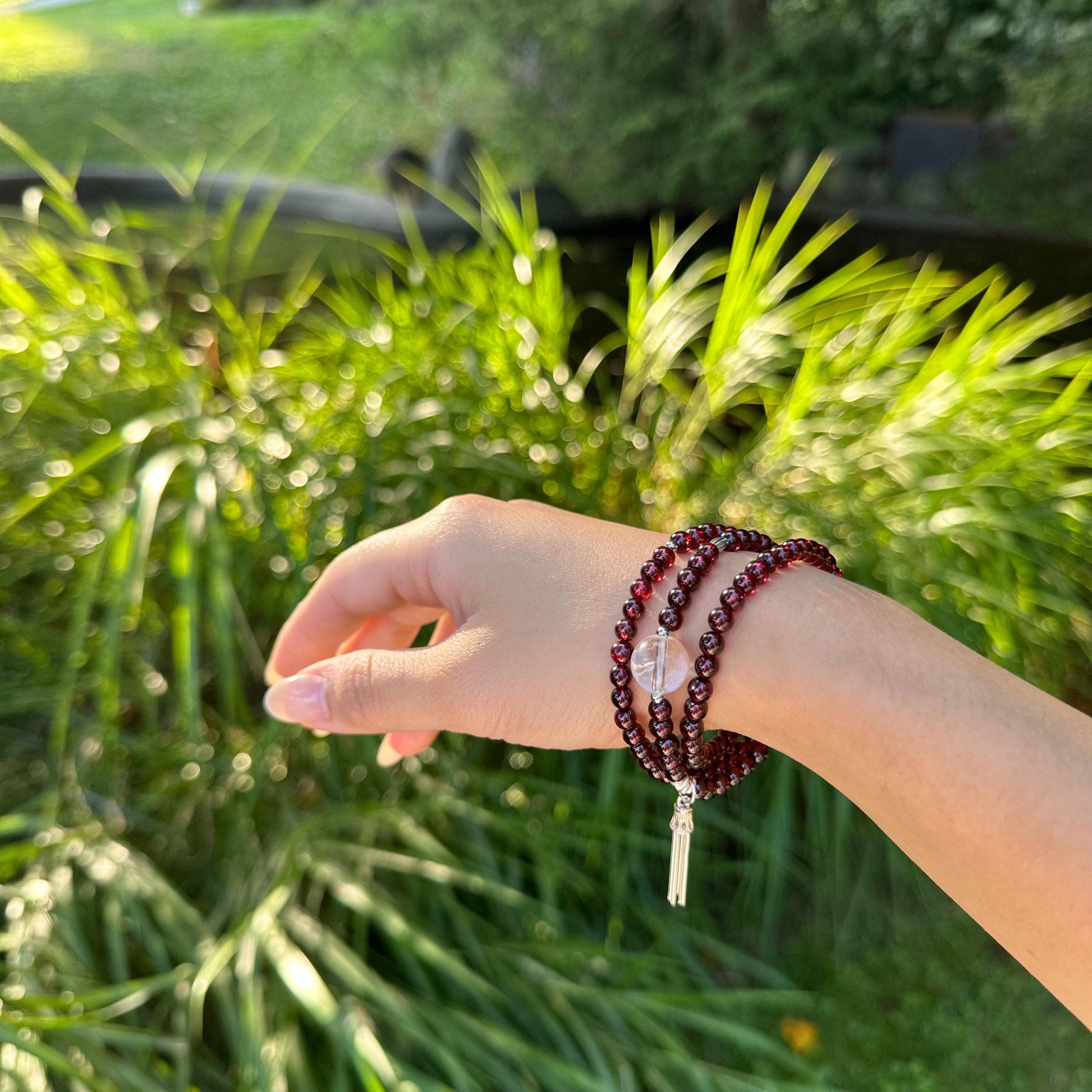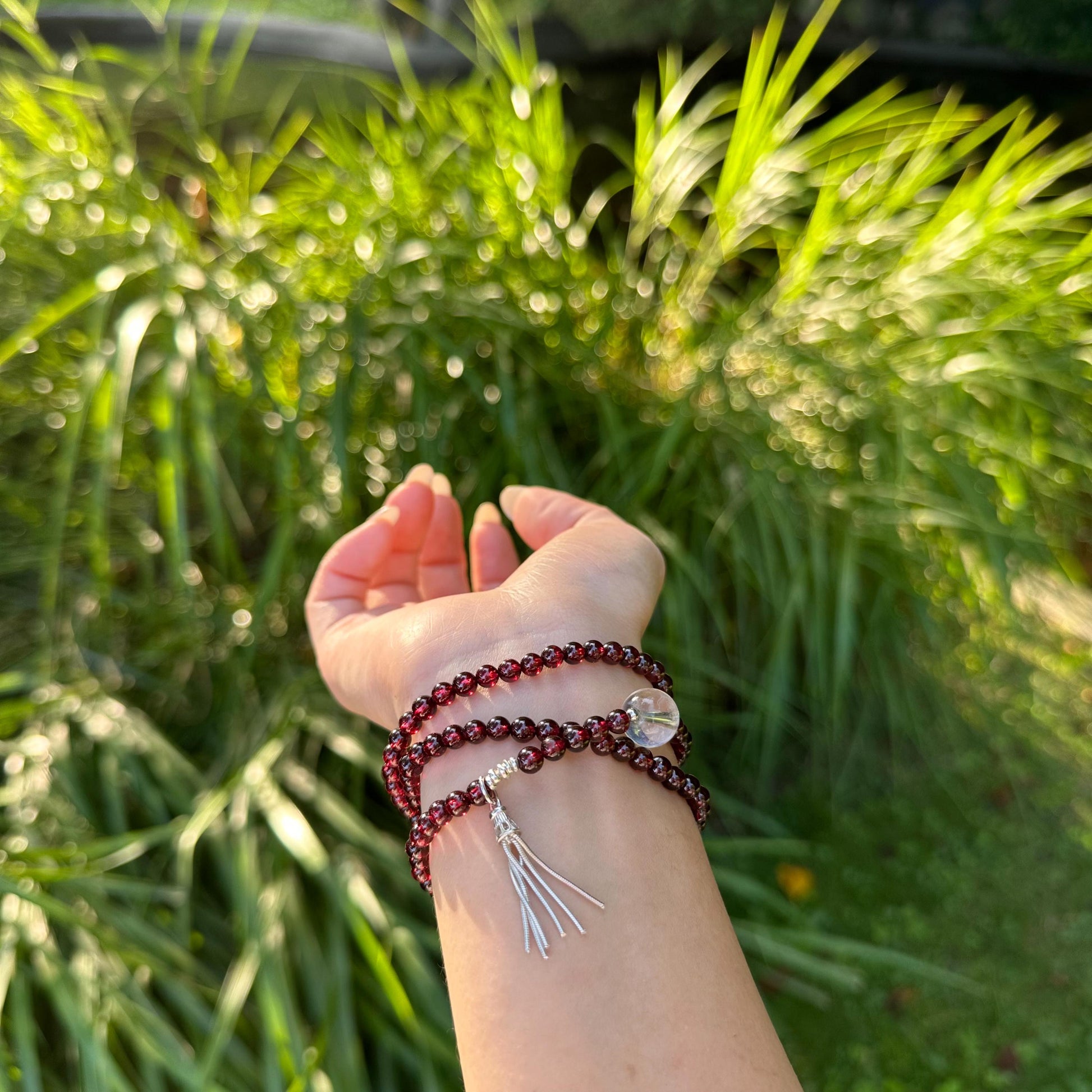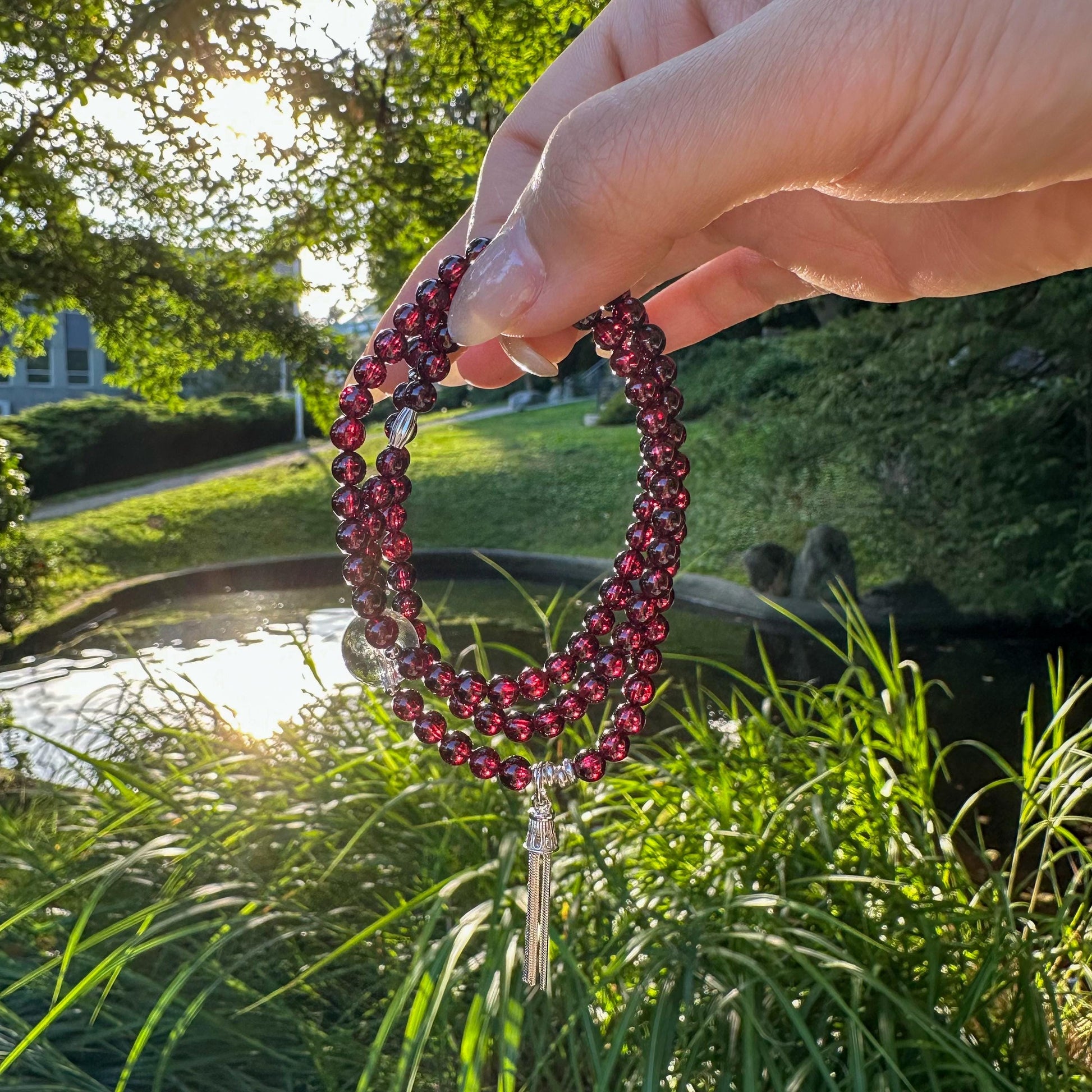 Handcrafted in three-layered strands, midnight garnet brings together deep crimson garnet with the soft gleam of sterling silver.