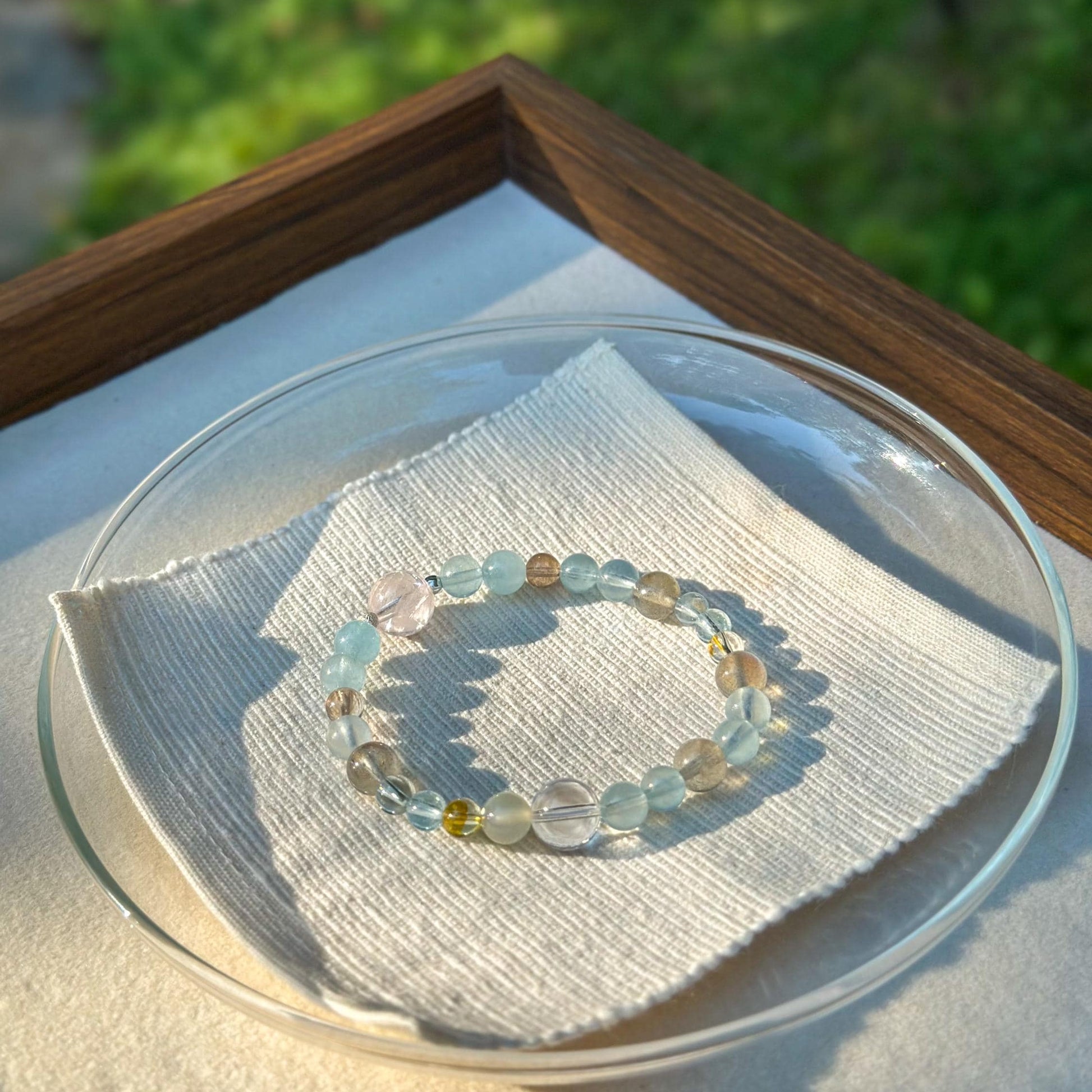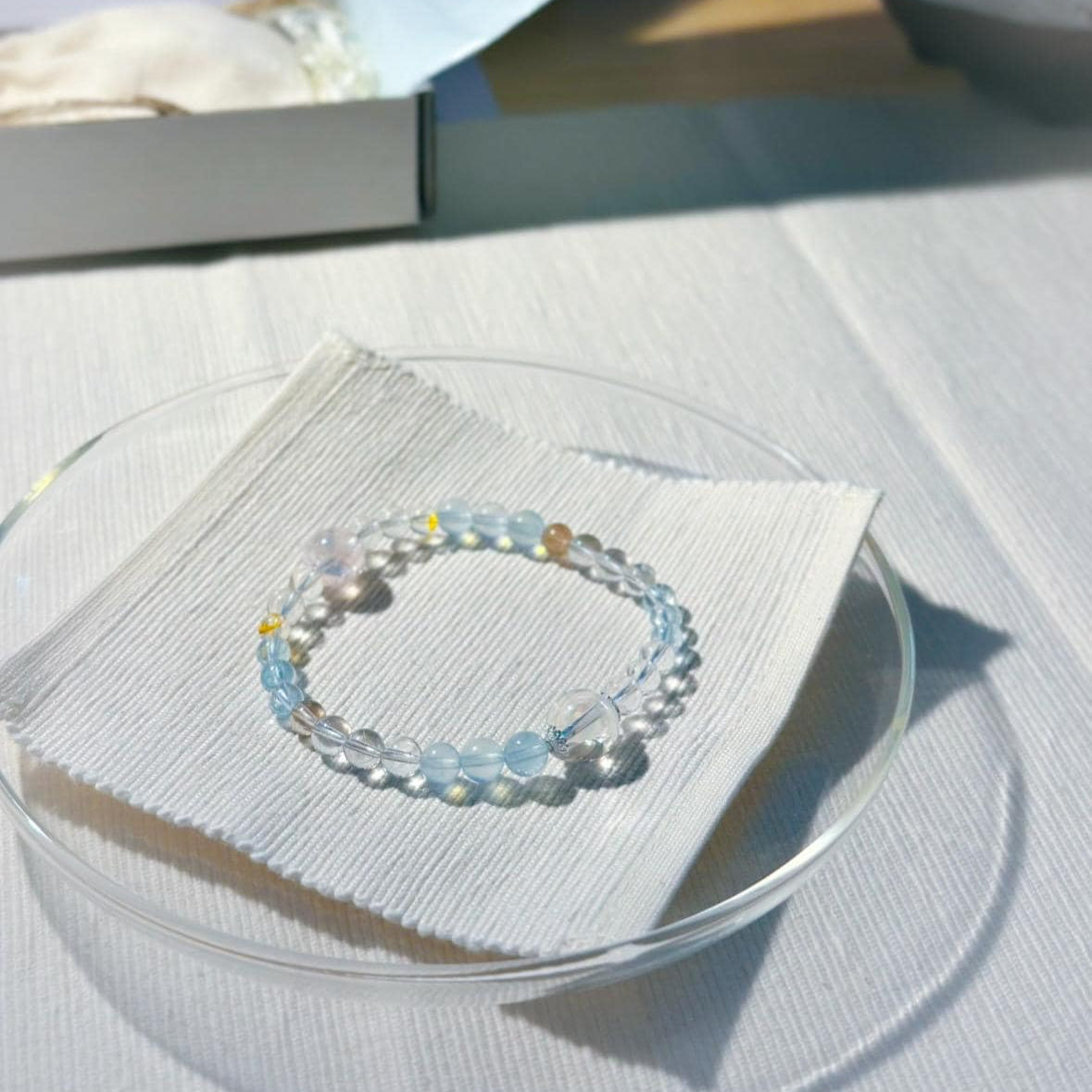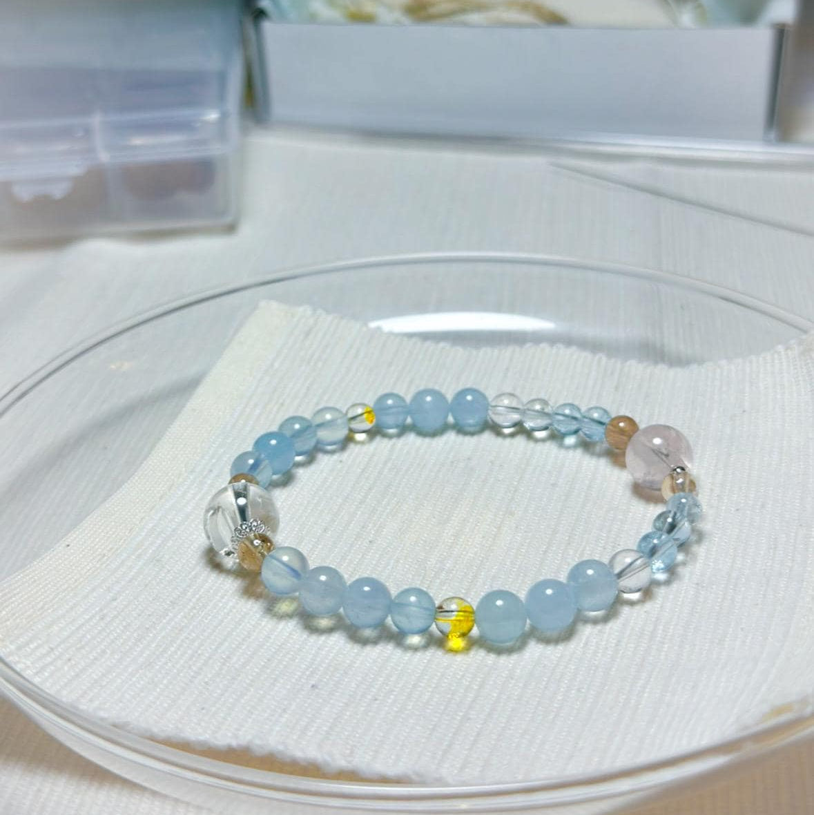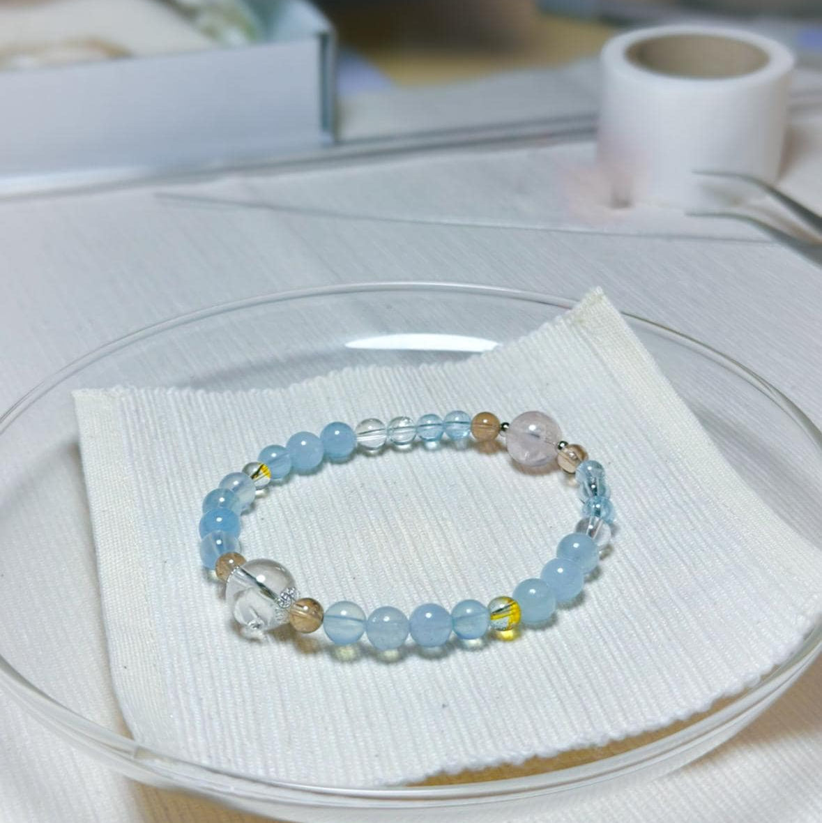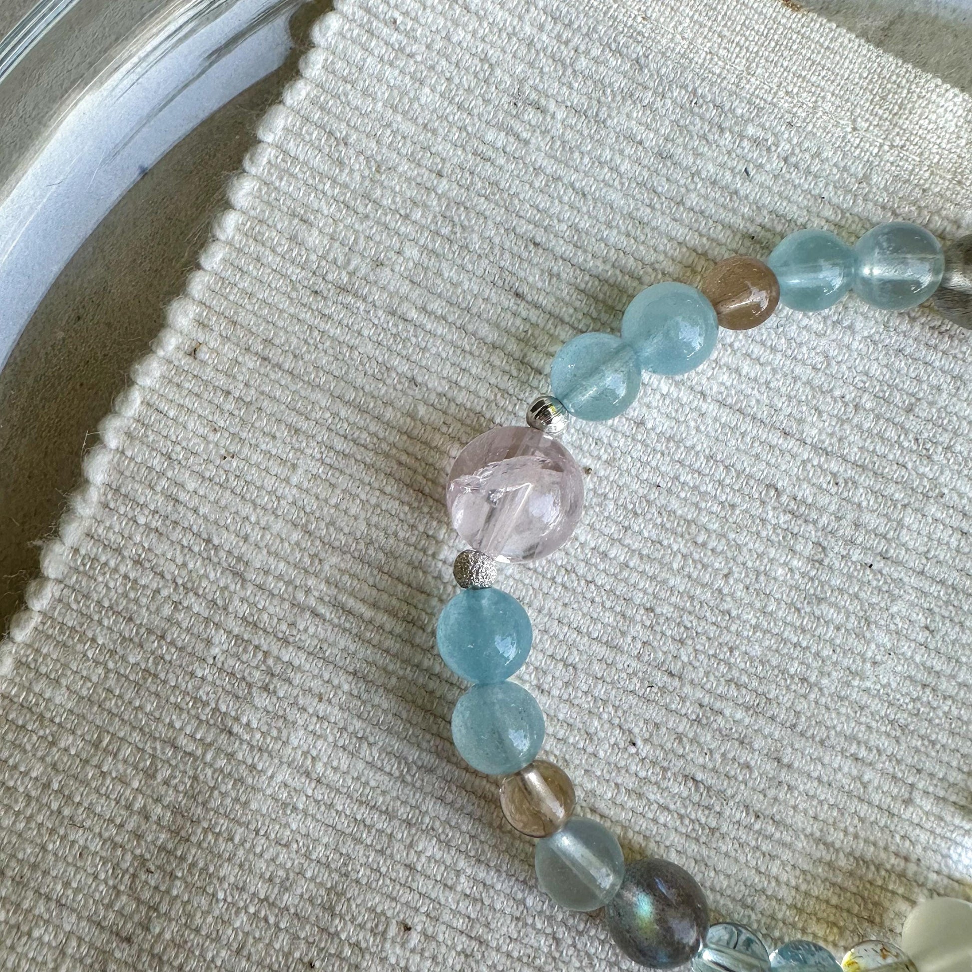 Handcrafted with rose quartz, aquamarine, topaz, and clear quartz, this bracelet brings together softness, clarity, and calm through form and material.