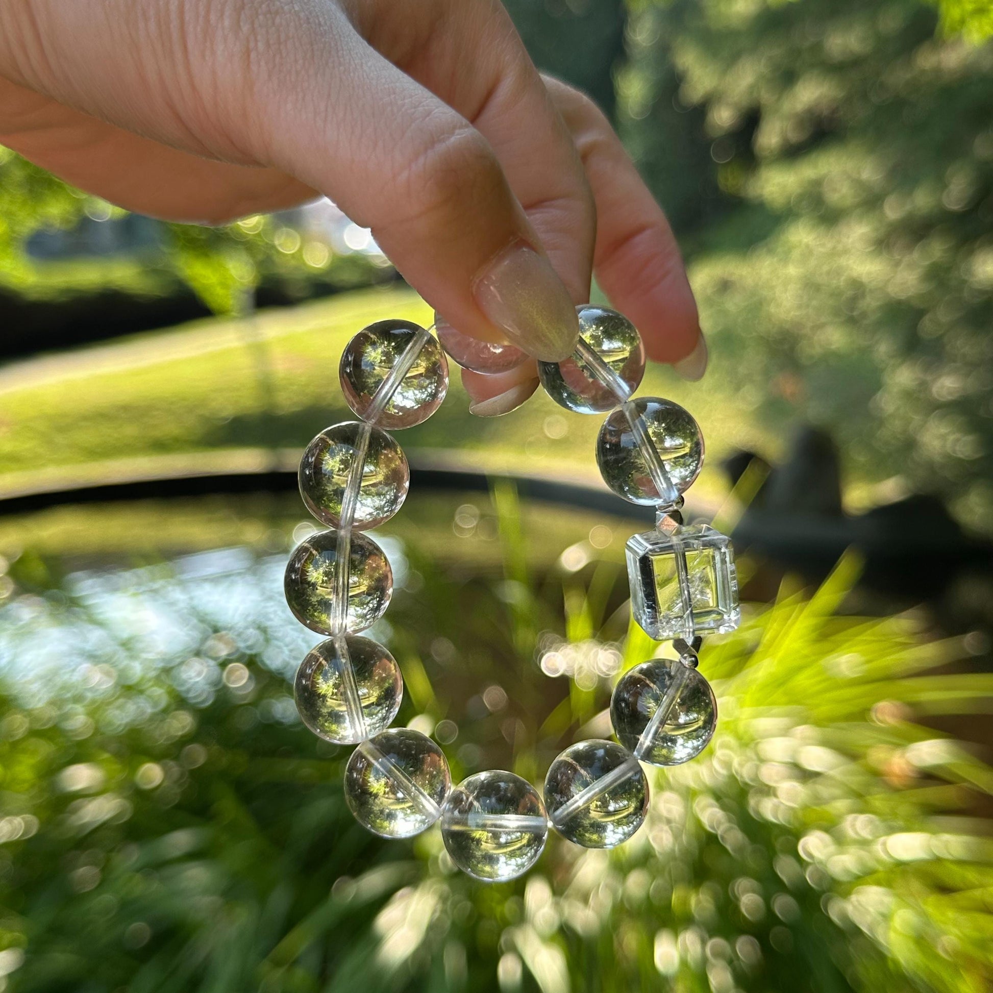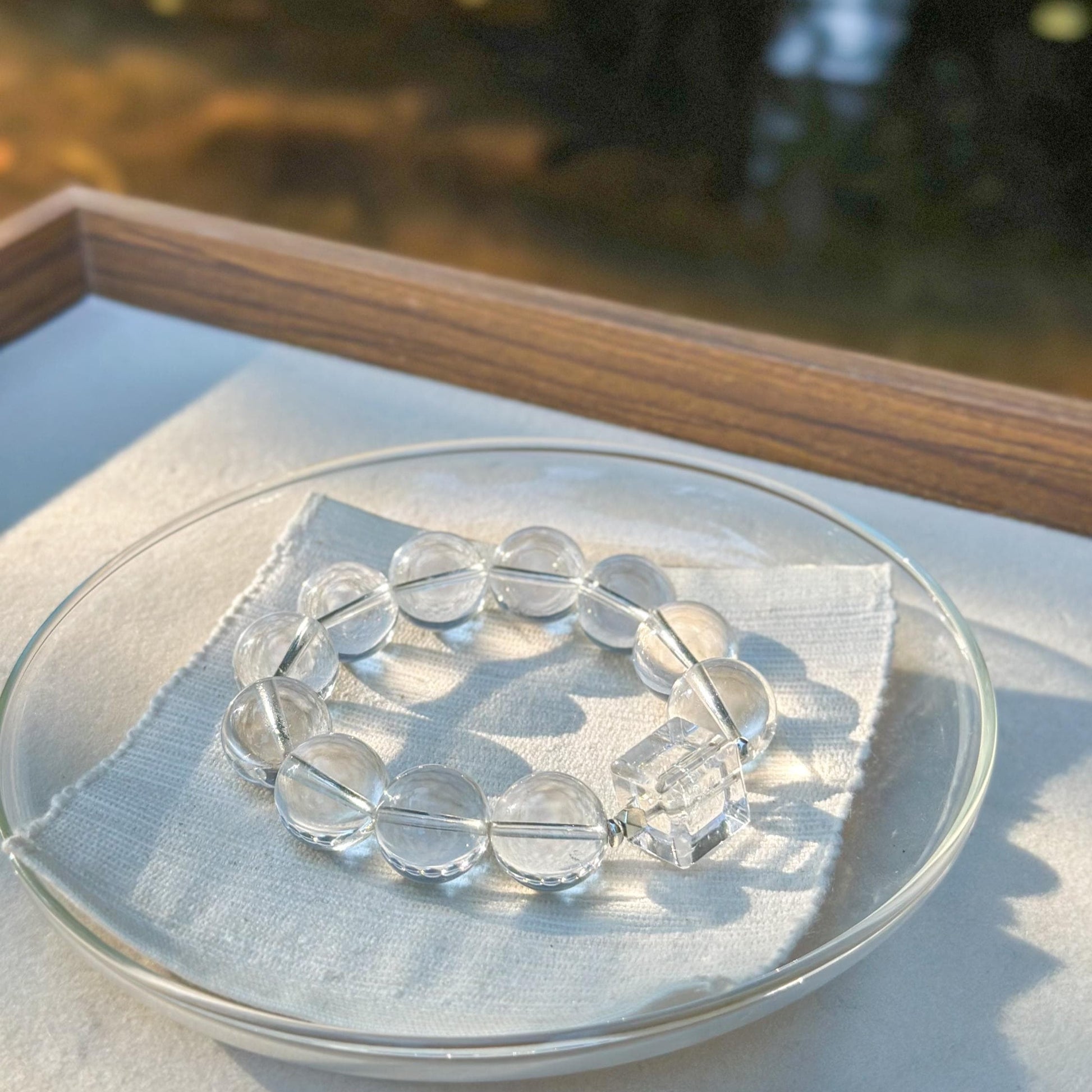 This bracelet reflects light softly through natural stone - clean, transparent, and timeless in character. Its clarity comes from material alone, allowing form and light to speak without distraction.